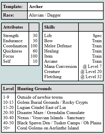 Looking to be an archer? One that is interested in a bit of close up combat at times without having to buff like an OG Archer would have to? Would you like to start with enough strength to be able to carry something more then a silk shirt? Do you require good fletching skills at an early level? This template may be the one for you. You can even start this one off without twinking.