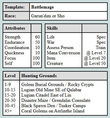 The Battlemage is one of the best PVM (Player vs. Monster) mage templates around. His high LIFE and WAR skills allow you to drop a vuln and kill with a war very easily without having to debuff your opponent. The only downfall to this template is the help you will need getting to level 50 - this is when your character gets CREATURE magic!