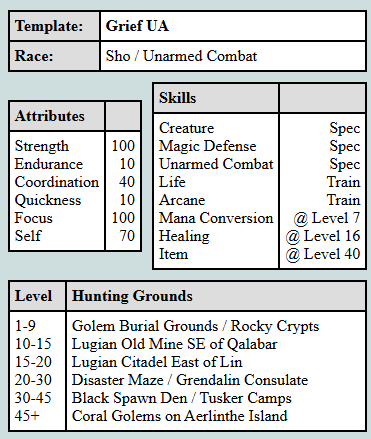 You should always start a Grief UA character with the maximum amount of FOCUS and SELF as possible to help with your debuffing and Magic Defense. If you plan to play this character to level 100, you may wish to start with 100 Strength, 100 Focus, 100 Self. You will still be able to get your Unarmed to around 405 self buffed at this level. The 40 points of Coordination gives you an extra 10 points of Unarmed Combat.