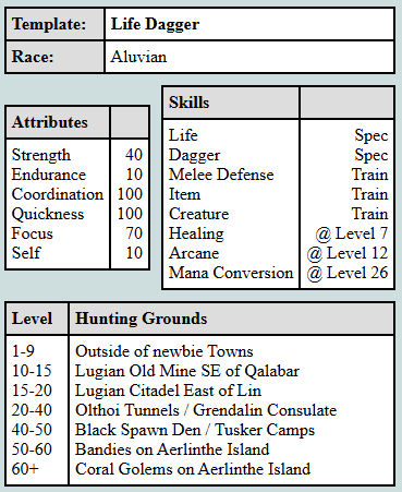 This template requires a bit of hard work in the beginning to get you going, but provides the benefits of having strong melee defense and life magic skills for a great combination of vulning and tanking. Dagger characters in general run faster and have higher melee defense skills - but their strength suffers because of the need for high Coordination and Quickness.