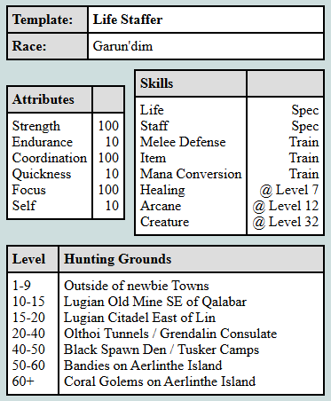 This template requires a bit of hard work in the beginning to get you going, but provides the benefits of having strong melee defense and life magic skills for a great combination of vulning and tanking.